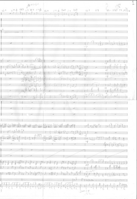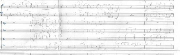 このバックグラウンドは、サキソフォンとPPGシンセをピアノが補うイメージです。2本のサキソフォンでは当該場面のコード(Bbm7とF7alt.)を完璧には構成できませんし、可能ならトロンボーンに内声を与えますが、主旋律を担当しています。また、トランペットは音域的に力不足でしょう。というわけで、録音物でかつポップスの音量バランスであることを見越して、ピアノと融合させることで良しとしました。結果はまぁまぁでした。やはりピアノは減衰音の楽器ですから、ロングトーンの場面で管楽器と融合させるには無理がありました。しかし両者の含む空間の質や量を極力近づけると、わずかに効果が上がると見られます。