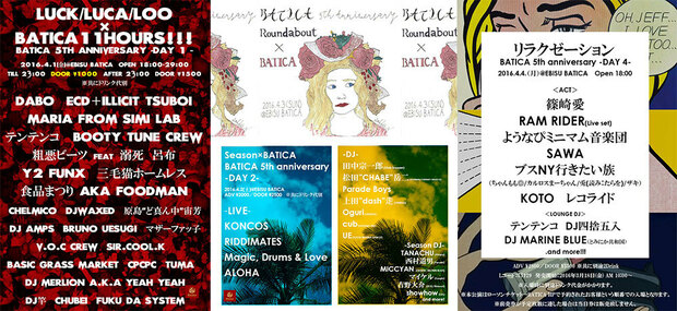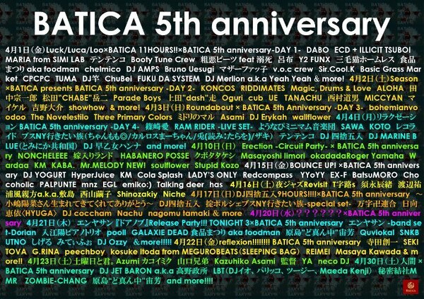 tofubeatsから灰野敬二、Seiho、奇妙礼太郎まで、ジャンル不問で多彩なアーティストが出演し、東京の夜を賑わせてきた恵比寿BATICA。Mikikiでも、Chocolat & Akito × Awesome City Clubの2組が〈Hostess Club Presents Sunday Special〉を語る洋楽インディー座談会をBATICAで行ったばかりだが、この愛すべきスポットが今年4月に5周年を迎えるのにあたり、1か月間に渡ってユニークな公演が多数催される。