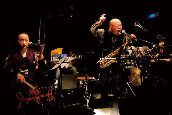 田中悠美子(義太夫三味線、ヴォイス)と福原千鶴(小鼓、ヴォイス)による日本の伝統楽器の音色がある郷愁をもって響いた次の瞬間には、坂田のサックス、ジムのエレクトリック・ギター、そして達久のドラムの音色が心を揺り戻す。揺れ動かないのは坂田の語りと絶叫とデス・ヴォイス。
