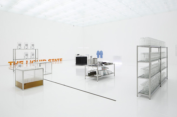 白く発光する展示空間に足を踏み入れると、チューブのついた四角い水槽、積み上げられたプラスチックのシャーレが目に入る。中央には黒光りした謎の立方体、彼らのトレードマークであるオレンジ色の「THE LIQUID STATE」の文字が白い床に反射している。まるでSF映画のセットのようなラボ空間で、3つのインスタレーションが日々変化し成長している。