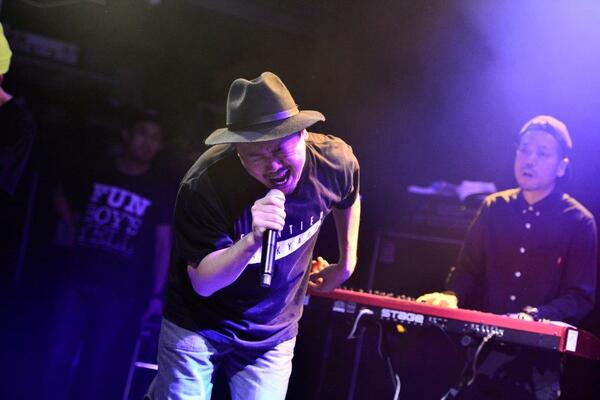 2009年のミニ・アルバム『Luka & Evans』に収録の“PEEPS CLUB”からスタートしたこの日のライヴは、まさにFBYの変化と進化の前兆を感じさせるものだった。まず驚いたのは、ヴォーカルに専念したTGMXとドラマー・TDCのオリジナル・メンバーに加え、以前から彼らをサポートしてきた松田“CHABE”岳二(キーボード/パーカッション他)とKONCOSの古川太一(シンセ・ベース他)、『FUN BOY'S YELL』のレコーディングにも参加したSAWAGIのコイチ(キーボード)と浅草ジンタのシーサー(トランペット)、SCAFULL KING時代からの盟友であるNARI(サックス)……と、まさかのギターレス! そして鍵盤3人! さらに生のホーン隊が参加!という、ドラスティックに変化を遂げたバンド編成。10年に渡ってギター・サウンドを採り入れてきたFBYだけに、過去の楽曲の演奏は大丈夫なのか?という心配が心をよぎるも、それはまったくの杞憂に過ぎなかった。これまでの人気曲が次々に披露されていき、それらにまつわる記憶を最新型へとアップデートしていく。