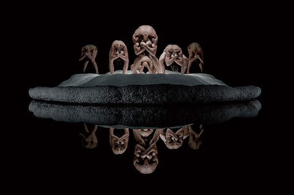 漆黒の闇に包まれた舞台。その中ほどに白い泡の浮島がある。それはカルデラや火口のようにも見える。舞台に登場したのは異様な肉の塊。ほぼ裸の状態で、腕や足を絡め合い、組み合うダンサーたち。首を前傾して折り込み、ヘッドレス(首なし)状態のまま、緩慢に、ときとして激しく動く。性別も国籍も、何人がそこにいるのかさえもわからない。ダンサーの個性も人間性も消し去られ、数本の脚が不気味に動く巨大な甲殻類が動めいているように見える。舞台一面には浅く水が張られていて、磨き上げられた漆の鏡面のように舞台上の浮島や肉の塊を映し出す。ヨーガのヘッドスタンドのように、首の付け根を床につけ逆立ちしたポーズを長時間続けたり、背中の肩甲骨付近の筋肉を盛り上げ、平家蟹さながらの表情を見せたり、海底か、宇宙の果ての星の、新種の原始生物を見ている気がしてくる。背景に流れる機械音の効果もあり、古代なのか近未来なのか、直線的でない時間が回りだす。なぜか、イザナギとイザナミの二柱の神が矛で混沌を回し島をつくった古事記の国産み(くにうみ)のシーンが頭に浮かんだ。