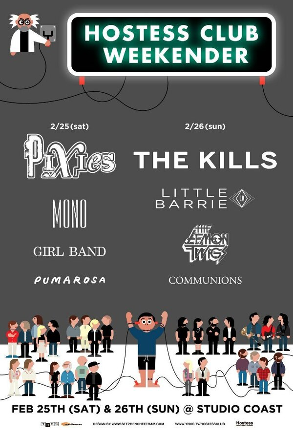 多くのロック・リスナーを虜にしてきたライヴ・イヴェント〈Hostess Club Weekender〉の第12回が2月25日(土)、26日(日)に東京・新木場STUDIO COASTで開催される。今回のラインナップは、25日にピクシーズ、MONO、ガール・バンド、ピューマローザ、26日にキルズ、リトル・バーリー、レモン・ツイッグス、コミュニオンズを揃えた計8組。Mikikiではもはや恒例となった〈HCW〉総力特集を今回もお届けする。25日のアクトを紹介した第1回に続き、この第2回は26日に出演する4組をフィーチャー。Mikiki編集部の小熊俊哉と田中亮太が、各出演アクトの魅力や注目ポイントをカジュアルに解説してみた。