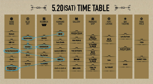さて、この移動で体力を使い果たさないように気を付けつつ(この〈気を付ける〉は主にお酒を控えるという意味)、続けてニュー・マスターサウンズのファンクネスを全身で味わう。観終わると17時くらい。ここで音楽からちょっと離れてヨガ・ブースへ。柄にもなく最近ヨガにハマっているから、というどうでもいい奥浜情報は置いておいて、突然ですがここで「モテキ」ファンの皆さんにもお伝えしておきたいことが。ドラマ版「モテキ」で小宮山夏樹役を演じられていた松本莉緒さんが、ヨガ・インストラクターとして17時半から教えてくれるそうです。女優さんだけでなくインストラクターとしても活躍されているのですね。ライヴ観賞の休憩にゆったり身体を動かしたい方は是非。お休みタイムも満喫したあとは日食なつこさん、トリのマイケル・フランティ&スピアヘッドを観て1日目終了!