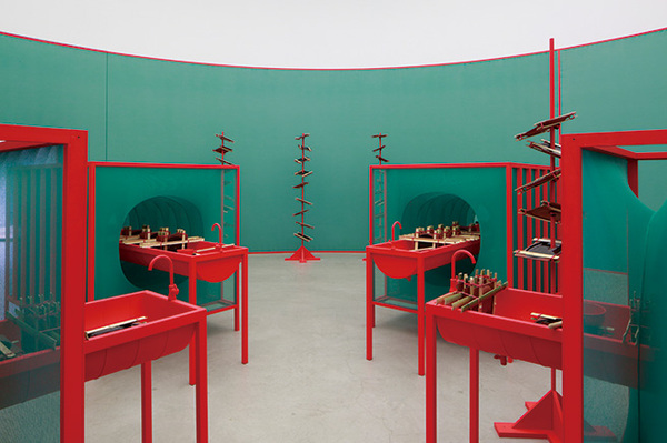 もう一つ私が興味深く感じたのは、両国の作家たちが社会に対して取るスタンスが、きわめて対照的だったことだ。たとえばデンマークのアーティストグループ〈SUPERFLEX〉は、世界トップクラスの投資銀行のビルをかたどった花鉢に、幻覚誘発植物を植えるという、辛辣なインスタレーションを展開している。また同時開催の〈ヨーガン レール 文明の終わり〉展では、ポーランド出身、日本在住の服飾家ヨーガン レールが、浜辺に漂着したプラスチックの廃材で組み上げたシャンデリアを展示した。同作はヨーガン レールの遺作であり、日本社会への遺言とも言える。