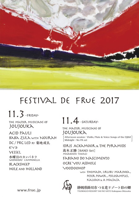 これまでにクラップ!クラップ!やエルメート・パスコアール、直近ではニュー・ザイオン・トリオなど、国やジャンルを問わずディープで刺激的なアーティストを招聘したイヴェントを多数仕掛けてきた団体、FRUE。彼らがオーガナイズする屋外音楽フェスティヴァル〈FESTIVAL de FRUE 2017〉が来る11月3日(金・祝)、4日(土)に静岡・掛川のつま恋リゾート 彩の郷で開催される。