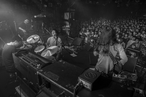 公演のタイトルが〈rule invisible〉だったとはいえ、3曲目にして早くも“見えないルール”が飛び出したのには驚きでしたが、やはり何より進化の旅をやめないOYAの現在進行形のサウンドを確認できたことが大きな収穫でした。陶酔でも覚醒でもない、あの独特なサイケデリアがクラウト・ロック的なリズムでさらに引き延ばされて時間の感覚が希薄になり……かと思った次の瞬間には出戸さんの歌声で〈こちら側〉に呼び戻される、みたいな宙ぶらりんな意識の状態が絶妙に心地よくて。会場をパンパンに埋め尽くしたお客さんたちも気持ちよさそうに爆音を浴びていました。