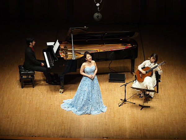 名曲“星に願いを”は、藤満健のアレンジで。「今のわたしならではの編曲になっています」と前置きして始まった演奏には、このリサイタルの直後に彼女が出演するオペラ「ばらの騎士」(R.シュトラウス)のモティーフが散りばめられていた。おそらく他の機会には使えないだろうから、この日かぎりの贅沢なアレンジだ。歌い終わった彼女が「おわかりになりました?」とたずねると客席から大きな拍手。みんななかなかのオペラ通なのだ。