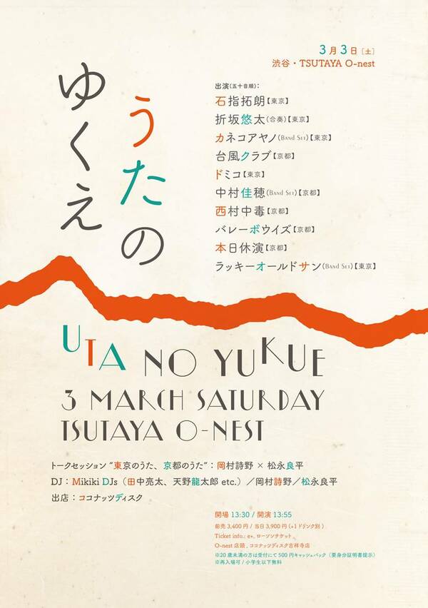 天野「〈東京と京都のうたを紡ぐ〉というイヴェントのテーマがすごく良いと思います。ライヴに加え、松永良平さんと岡村詩野さんによるトーク・セッションもあるみたいですね。それぞれ東京と京都を拠点に長年、執筆活動をされているお2人だけに、刺激的なお話が聞けそうです。2018年の東京と京都という街で生まれる〈うた〉について深く思いを巡らせるような良い企画。やっぱり、いまも昔も街と〈うた〉の関係って切っても切れないものだと思います。その関係性が時代とともに変化していっていることも、今回のイヴェントでは感じられそうです」