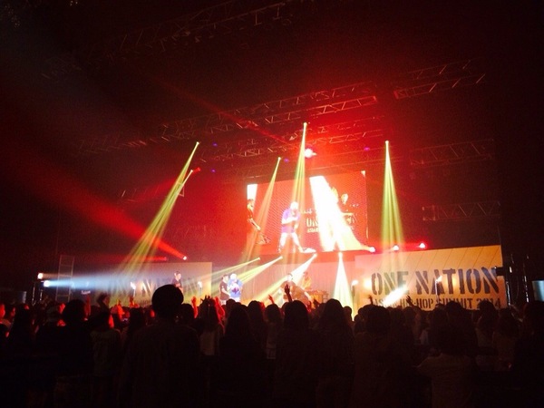 後半は、クリス・ブラウンの“Turn Up The Music”みたいな“Body2Body”や“I Like 2 Party”などのアッパー・チューンを連発し(LOCOくんも出てきました)、クライマックスはリリースしたばかりの“Taekwondo”! サビに向けてグイグイとアゲていくこの曲で、ついにJAYがフロアへ雪崩れ込み、そこにいた青年と肩を組みつつ揉みくちゃになる! いや~イイですね~。そして最後はイリオネアの皆さんも登場してのDOK2“Handz Up”(JAYがフィーチャーされている曲)。ダンスホール風味でエラくカッコイイこの曲、これをみんなが寄ってたかってマイクを回して……いや~イイですね~。