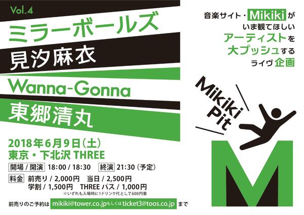 Mikikiがいま、このタイミングで観て欲しい出演陣を揃えたショウケース企画〈Mikiki Pit〉。KONCOS、Bullsxxt、JABBA DA FOOTBALL CLUB、Ms.Machineを迎えた第3回も大盛況/大充実の内容で終わりましたが、早くも第4回を開催します! 今回、登場するのはミラーボールズ、見汐麻衣、Wanna-Gonna、東郷清丸の4組。日時は2018年6月9日(土) 、場所は東京・下北沢THREEです。