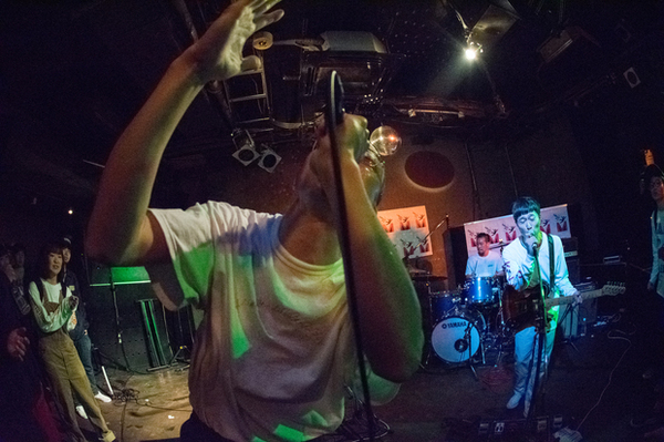 はちゃめちゃだけど心を揺さぶるステージを続ける彼らだが、今度はステージ上のオーディエンスに対して古川が「ちょっとステージから下りてもらっていいですか?」と言うと、紺野清志(ドラムス)と共に楽器を持ってステージに上がり、フロアーに残った佐藤寛(ヴォーカル/ギター)とは観客を挟むような隊形をとる。このサプライズを観ていたお客さんは前を観て、後ろを観ての大忙し。そのまま古川と佐藤が何度も〈今年は僕らの年になるよ〉と語りかけると、ゾンビーズの名曲“This Will Be Our Year”のカヴァー“今日からスタート”を歌い上げ、約30分間のライヴはあっという間にフィニッシュする。