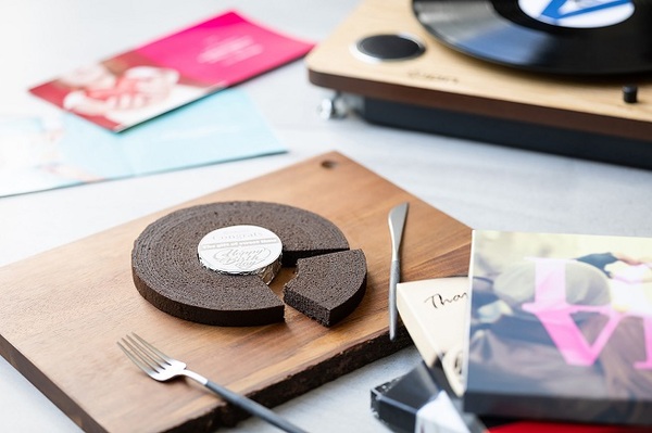 香川県高松市にある洋菓子専門店の〈ラ・ファミーユ〉が新しい音楽ギフトとして提案したのが〈バウム・レコード〉だ。まるでレコード盤のようなココアベースのバウムクーヘンとセンターレーベルにガレットブルトンヌが鎮座する。よりレコード盤に近づけるため真っ黒なバウムクーヘンはチョコやカカオをふんだんに使用している濃厚な生地なため、二日間に分けて丁寧に焼き上げる手の込んだ上等スイーツ仕様。パッケージはレコード店のショッピングバックを模した袋と紙ジャケット仕様の箱にイン。細部に渡ってこだわりが感じられ、アナログ・レコードファンも満足できる出来栄え。まさに食べられるレコードなのだ。