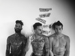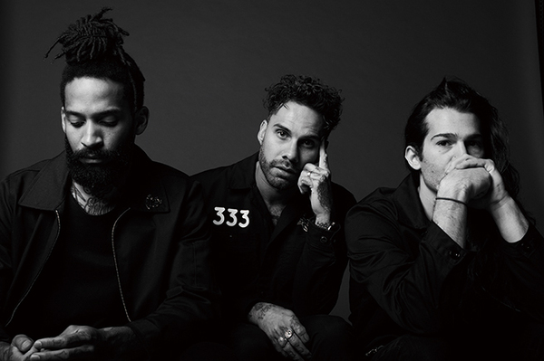 とにもかくにも、パンツ、パンツ、またパンツ。揃いも揃ってパンツ一丁なのである。昨夏の〈フジロック〉での本邦初ライヴを前に、〈準備万端で苗場入り、といきたいところだ〉と本誌に書かせていただいたLA発の新星3人組、フィーヴァー333。実際に準備万端で苗場の〈WHITE STAGE〉で待ち受けていたところ、そこでバンドが挨拶代わりとばかりに披露したのは、鮮烈なパンイチ姿でのパフォーマンスだった。しかも、2曲目で早くもフロアへ突っ込んでいったジェイソン・アーロン・バットラー(ヴォーカル)は、パンイチになるや雨でびしょ濡れのステージ上でスライディングや宙返りを連発し、さらにはスティーヴン・ハリソン(ギター)と共に、機材車か中継車と思われるトラックの屋根でプレイするという、前代未聞のライヴを繰り広げたのだ。