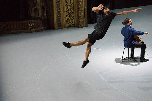 「我ら人生のただ中にあって/バッハ無伴奏チェロ組曲」は、バッハの6曲からなるチェロ組曲を選び、世界的チェロ奏者ジャン=ギアン・ケラスとの対話からケースマイケルが振り付け、彼女自身を含めた5人が踊る。バッハの楽曲の構造を身体に受肉させるために、振付家はニュートンとライプニッツの重力論を検討し、西洋と東洋の空間概念の違いにまで考察を進めたという。床に描かれた幾何学図形も作品の鍵だが、振付の立位と臥位、前進と後退、集団の遠心性と求心性もまた象徴的な意味を担い、魂に深く語りかけるライヴ演奏のチェロの響きと共に、崇高の境地を追い求めてやまない人間精神の旅を喚起する。
