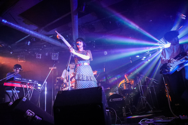 この日の一番手はPOLLYANNA。ドラムス・ワタナベタカシ、キーボード・飯島快雪、ベース・斎藤モトキ、ギター・qurosawaの男子4人に続いてヴォーカル・伶菜が姿を現し、1曲目の“pantomime”からスタート。ウォーキング・ベースでジャジーな演奏に、伶菜の小悪魔的な歌声が乗るこの曲は、今年リリース予定のアルバムのタイトル曲だとか。飯島のクールなキーボード・ソロも炸裂し、客席の視線を一気に集めていく。2曲目はファースト・ミニ『CIRCLE』より、〈最新型渋谷系〉を体現する疾走オシャレ・ロック“Furniture and Moving”。〈スーパー・ギタリスト! qurosawa!〉と紹介されると、qurosawaがギター・ソロをクールにかき鳴らす。簡単な挨拶の後は、セカンド・ミニ『Breaking News』収録曲“いない・いない”と“らせん”へ。男子4人のテクニカルな演奏と切ないコード感が組み合わさり、〈これぞPOLLYANNAの真骨頂〉といった感じ。