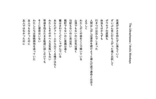 気鋭の若手詩人・黒川隆介が毎回、洋邦/新旧を問わず、気になるアーティストの楽曲を1曲ピックアップし、その歌詞を咀嚼して、アンサーソングならぬ〈アンサーポエム〉を書き下ろすこの連載。3回目は、黒川氏が学生時代より好きだというアークティック・モンキーズの、2018年作『Tranquility Base Hotel & Casino』より“The Ultracheese”です。黒川氏が楽曲を浴びた結果生まれたアンサーポエム、ぜひ楽曲を聴きながらお楽しみください。 *Mikiki編集部