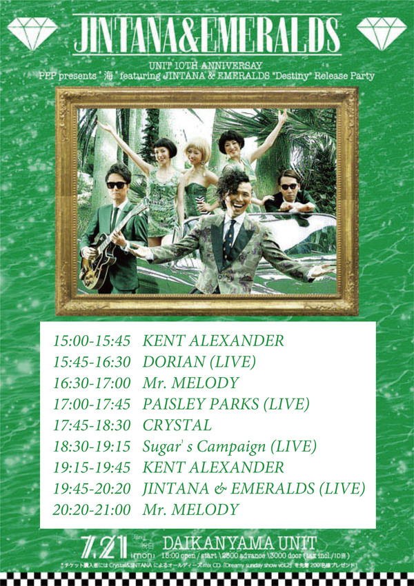 ネオ・ドゥワップ・バンドのJINTANA & EMERALDSが今年4月にリリースしたファースト・アルバム『Destiny』の収録曲“RUNAWAY”を、PAN PACIFIC PLAYA(PPP)のLatin Quarterがチル&ドリーミンにリミックス。これは7月21日(月・祝)に東京・代官山UNITで行われる『Destiny』のリリース・パーティーを記念したトラックで、PPPのSoundCloudにてイヴェント当日までフリー・ダウンロード可能となっている(その後はストリーミング公開のみ)。なお、リリパにはSugar's CampaignやDorianらも出演。アーバン&ソウルフルな一日を堪能して!