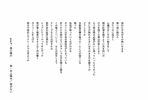 気鋭の若手詩人・黒川隆介が毎回、洋邦/新旧を問わず、気になるアーティストの楽曲を1曲ピックアップし、その歌詞を咀嚼して、アンサーソングならぬ〈アンサーポエム〉を書き下ろすこの連載。7回目は、言わずと知れた井上陽水の名曲“傘がない”です。黒川氏が楽曲を浴びた結果生まれたアンサーポエム、ぜひ楽曲を聴きながらお楽しみください。 *Mikiki編集部