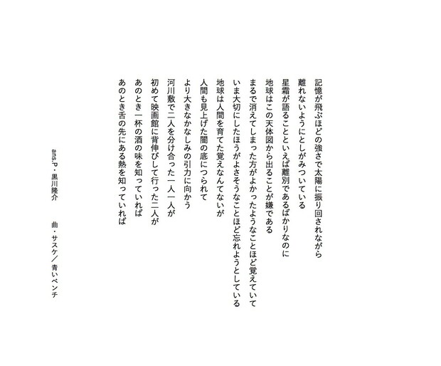 気鋭の若手詩人・黒川隆介が毎回、洋邦/新旧を問わず、気になるアーティストの楽曲を1曲ピックアップし、その歌詞を咀嚼して、アンサーソングならぬ〈アンサーポエム〉を書き下ろすこの連載。8回目は、2009年のサスケの名曲“青いベンチ”です。黒川氏が楽曲を浴びた結果生まれたアンサーポエム、ぜひ楽曲を聴きながらお楽しみください。 *Mikiki編集部