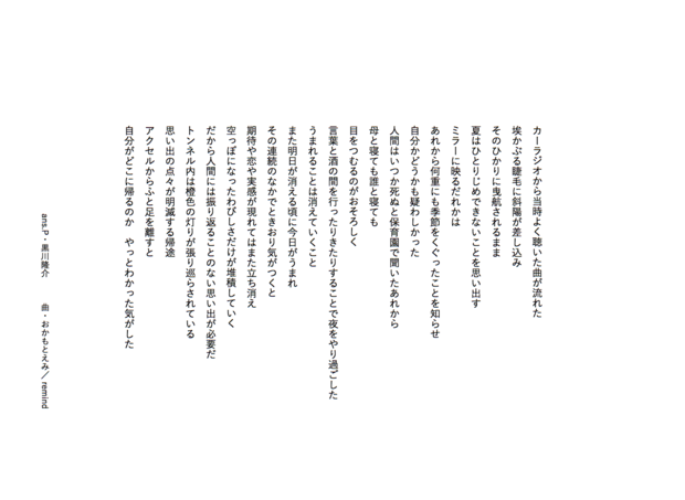 おかもと「そうだね、たしかに。目に入ったものがそのまま詞になっているところとか、目の前の現象が言葉で表せない時によく〈これなんだろう?〉って思ったり」