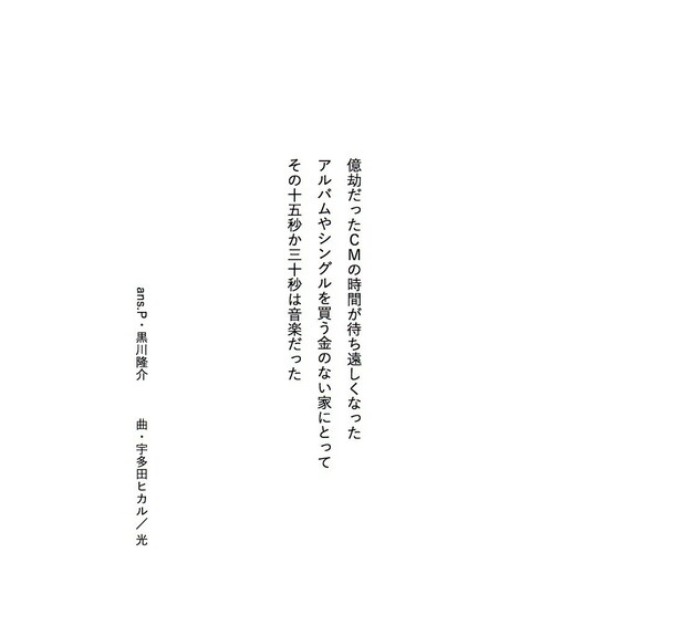 気鋭の若手詩人・黒川隆介が毎回、洋邦/新旧を問わず、気になるアーティストの楽曲を1曲ピックアップし、その歌詞を咀嚼してアンサーソングならぬ〈アンサーポエム〉を書き下ろすこの連載。12回目は2002年のヒット曲、宇多田ヒカルの“光”です。黒川氏が楽曲を浴び続けた結果生まれたアンサーポエム、ぜひ楽曲を聴きながらお楽しみください。 *Mikiki編集部