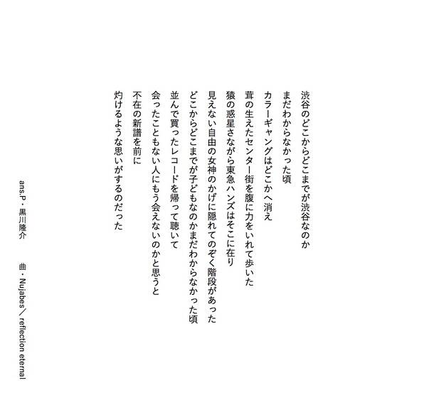 気鋭の若手詩人・黒川隆介が毎回、洋邦/新旧を問わず、気になるアーティストの楽曲を1曲ピックアップし、その歌詞を咀嚼してアンサーソングならぬ〈アンサーポエム〉を書き下ろすこの連載。15回目となる今回は、Nujabesの2005年作『Modal Soul』収録曲“reflection eternal”を取り上げます。黒川氏が楽曲を浴び続けた結果生まれたアンサーポエム、ぜひ楽曲を聴きながらお楽しみください。 *Mikiki編集部