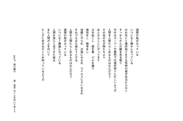 気鋭の若手詩人・黒川隆介が毎回、洋邦/新旧を問わず、気になるアーティストの楽曲を1曲ピックアップし、その歌詞を咀嚼してアンサーソングならぬ〈アンサーポエム〉を書き下ろすこの連載。16回目は、言わずと知れた国民的人気ソング、坂本九の“上を向いて歩こう”を取り上げます。黒川氏が楽曲を浴び続けた結果生まれたアンサーポエム、ぜひ楽曲を聴きながらお楽しみください。 *Mikiki編集部