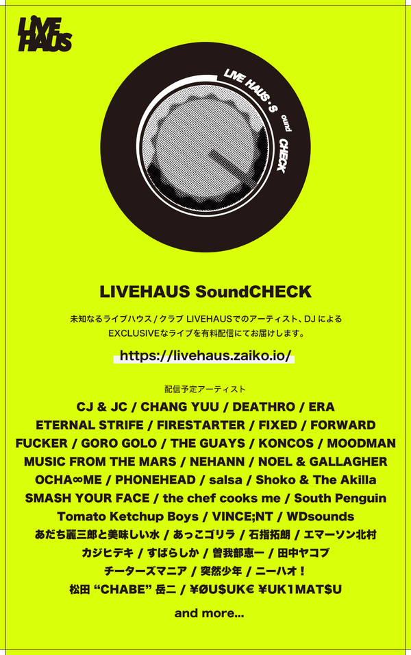 4月オープンを予定していたが、新型コロナウイルス感染症の影響を受け、いまだ開店の見通しを立てられない状況にあるLIVE HAUS。下北沢THREEの前店長、スガナミユウも代表に名を連ねる同店が、この度有料配信のプログラム〈LIVEHAUS SoundCHECK〉をスタートさせる。