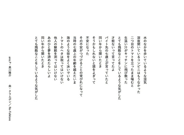 気鋭の若手詩人・黒川隆介が毎回、洋邦/新旧を問わず、気になるアーティストの楽曲を1曲ピックアップし、その歌詞を咀嚼してアンサーソングならぬ〈アンサーポエム〉を書き下ろすこの連載。22回目は、クラムボン “Re-Folklore”です。黒川氏が楽曲を浴び続けた結果生まれたアンサーポエム、ぜひ楽曲を聴きながらお楽しみください。 *Mikiki編集部