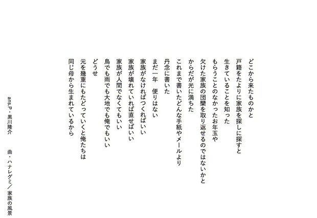 気鋭の若手詩人・黒川隆介が毎回、洋邦/新旧を問わず、気になるアーティストの楽曲を1曲ピックアップし、その歌詞を咀嚼してアンサーソングならぬ〈アンサーポエム〉を書き下ろすこの連載。24回目は、ハナレグミの“家族の風景”です。黒川氏が楽曲を浴び続けた結果生まれたアンサーポエム、ぜひ楽曲を聴きながらお楽しみください。 *Mikiki編集部
