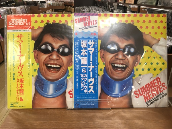 坂本龍一&カクトウギ・セッションの79年作『サマー・ナーヴス』。ど派手な黄色の背景に、スイミング・ゴーグルとコルセット(?)を着けた教授が弾ける笑顔を見せているジャケットが印象的な、まさに〈夏!〉なレコードです。