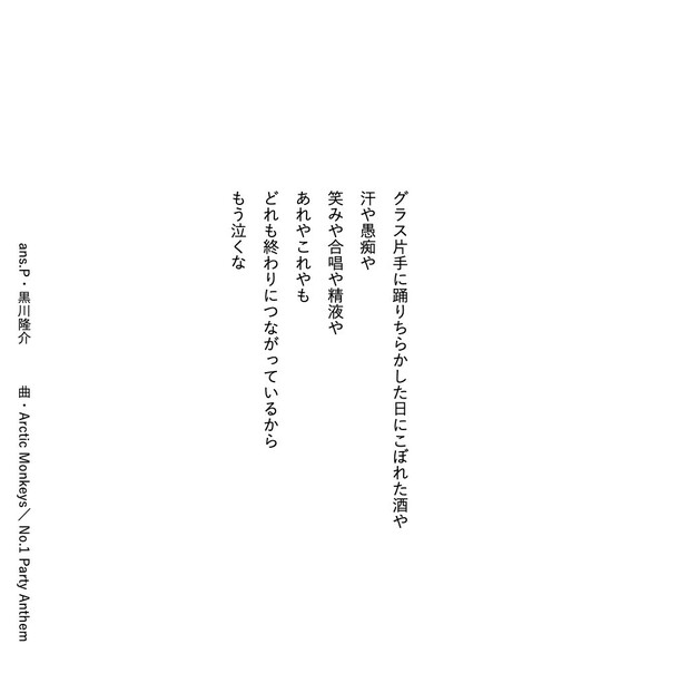 気鋭の若手詩人・黒川隆介が毎回、洋邦/新旧を問わず、気になるアーティストの楽曲を1曲ピックアップし、その歌詞を咀嚼してアンサーソングならぬ〈アンサーポエム〉を書き下ろすこの連載。今回は、取り上げるのは2度目となるアークティック・モンキーズより“No.1 Party Anthem”です。黒川氏が楽曲を浴び続けた結果生まれたアンサーポエム、ぜひ楽曲を聴きながらお楽しみください。 *Mikiki編集部