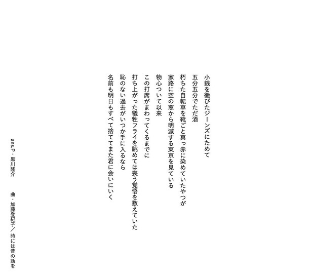 気鋭の若手詩人・黒川隆介が毎回、洋邦/新旧を問わず、気になるアーティストの楽曲を1曲ピックアップし、その歌詞を咀嚼してアンサーソングならぬ〈アンサーポエム〉を書き下ろすこの連載。今回取り上げるのは、アニメ映画「紅の豚」のエンディング・テーマとしても知られる加藤登紀子の“時には昔の話を”です。黒川氏が楽曲を浴び続けた結果生まれたアンサーポエム、ぜひ楽曲を聴きながらお楽しみください。 *Mikiki編集部