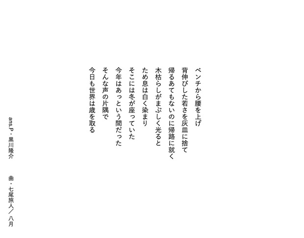 気鋭の若手詩人・黒川隆介が毎回、洋邦/新旧を問わず、気になるアーティストの楽曲を1曲ピックアップし、その歌詞を咀嚼してアンサーソングならぬ〈アンサーポエム〉を書き下ろすこの連載。今回取り上げるのは、七尾旅人の1998年のEP『OMOIDE OVER DRIVE』より、“八月”です。黒川氏が楽曲を浴び続けた結果生まれたアンサーポエム、ぜひ楽曲を聴きながらお楽しみください。 *Mikiki編集部