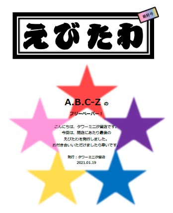 ★2017年に1号目を発行してから、約4年が経ちました。リリース時やメンバーの誕生日など、不定期ではありましたが、こんなにたくさん発行できて、驚いています。そして、皆様にご愛読頂けた事にも驚いていますし、とても嬉しいです。スタッフの主観満載のレポートなどばかりで、楽しんで頂けるか、いつも不安があったのですが、楽しみにしていると言うお声を頂けて、ここまで続ける事が出来ました。これまでに、1回でも「えびたわ」をお手に取って頂いた皆様、本当に有り難うございます! 皆様のお陰で、えび担で良かったと思える事が数えきれない程あります。これからも、A.B.C-Zの皆さんとえび担の皆様が、末永く幸せでいられるように願っています。ここまで読んでくださり、有り難うございました!