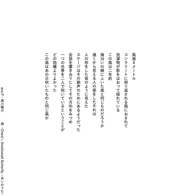 気鋭の若手詩人・黒川隆介が毎回、洋邦/新旧を問わず、気になるアーティストの楽曲を1曲ピックアップし、その歌詞を咀嚼してアンサーソングならぬ〈アンサーポエム〉を書き下ろすこの連載。今回取り上げるのは、名曲 “Swallowtail Butterfly 〜あいのうた〜”のCharaヴァージョンです。黒川氏が楽曲を浴び続けた結果生まれたアンサーポエム、ぜひ楽曲を聴きながらお楽しみください。 *Mikiki編集部