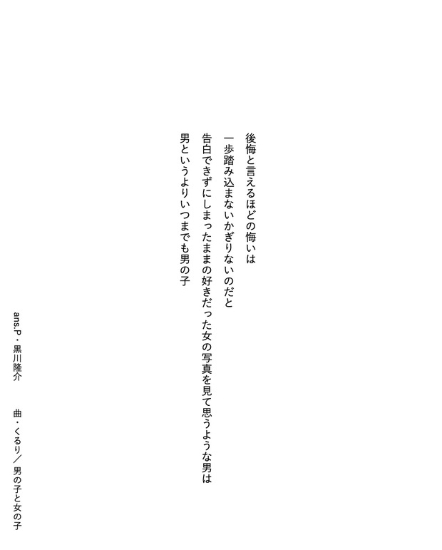 気鋭の若手詩人・黒川隆介が毎回、洋邦/新旧を問わず、気になるアーティストの楽曲を1曲ピックアップし、その歌詞を咀嚼してアンサーソングならぬ〈アンサーポエム〉を書き下ろすこの連載。今回取り上げるのは、来週新作もリリースされるくるりの楽曲“男の子と女の子”です。黒川氏が楽曲を浴び続けた結果生まれたアンサーポエム、ぜひ楽曲を聴きながらお楽しみください。 *Mikiki編集部