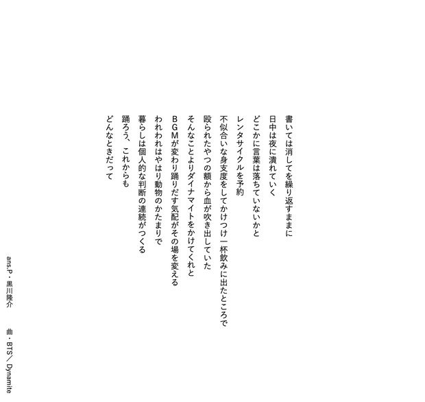 気鋭の若手詩人・黒川隆介が毎回、洋邦/新旧を問わず、気になるアーティストの楽曲を1曲ピックアップし、その歌詞を咀嚼してアンサーソングならぬ〈アンサーポエム〉を書き下ろすこの連載。今回取り上げるのは、BTSの大ヒット曲“Dynamite”です。黒川氏が楽曲を浴び続けた結果生まれたアンサーポエム、ぜひ楽曲を聴きながらお楽しみください。 *Mikiki編集部