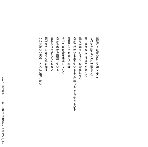 気鋭の若手詩人・黒川隆介が毎回、洋邦/新旧を問わず、気になるアーティストの楽曲を1曲ピックアップし、その歌詞を咀嚼してアンサーソングならぬ〈アンサーポエム〉を書き下ろすこの連載。今回取り上げるのはKID FRESINOの“by her feat. 茂千代”です。黒川氏が楽曲を浴び続けた結果生まれたアンサーポエム、ぜひ楽曲を聴きながらお楽しみください。 *Mikiki編集部