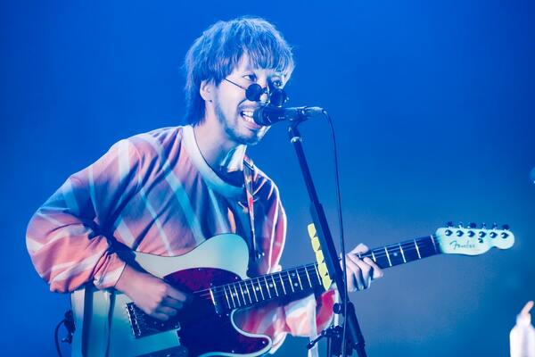 〈ライブハウスへようこそ!〉という岩下の合図とともに“おいしい水”へ。〈かわき〉の歌詞に合わせてあくびが手をタコ?それとも幽霊?のようにして左右に振ると、それに応えるオーディエンス。声を出せない中で、まるでライブハウスにおける新たな一体感が生まれているようだった。そのまま“ただし、BGM”へ。イザキのうねるベース、あくびの印象的でスペイシーなシンセサイザー、岩下の刻むギターのグルーヴで、観客を沸かせていく。