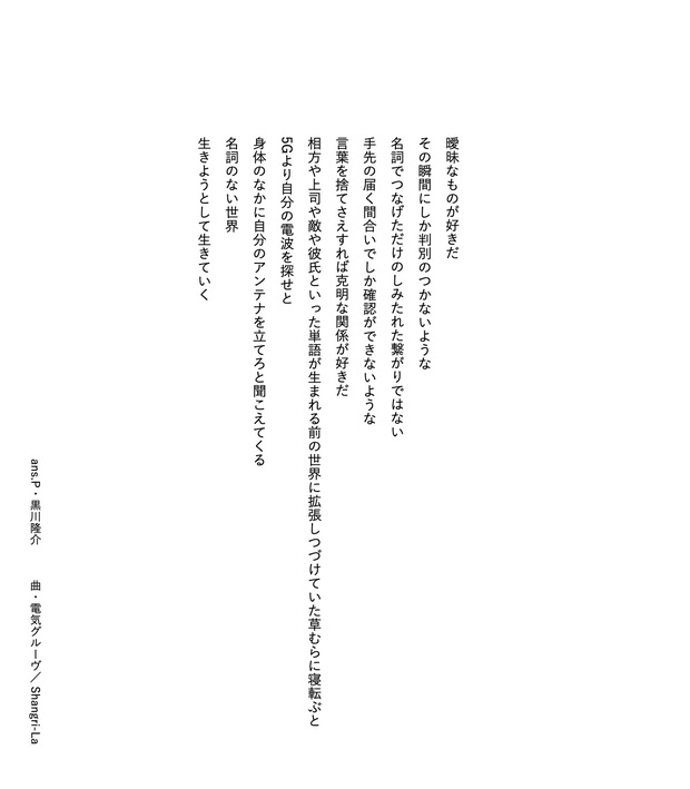 気鋭の若手詩人・黒川隆介が毎回、洋邦/新旧を問わず、気になるアーティストの楽曲を1曲ピックアップし、その歌詞を咀嚼してアンサーソングならぬ〈アンサーポエム〉を書き下ろすこの連載。54回目の今回取り上げるのは、電気グルーヴの“Shangri-la”です。黒川氏が楽曲を浴び続けた結果生まれたアンサーポエム、ぜひ楽曲を聴きながらお楽しみください。 *Mikiki編集部