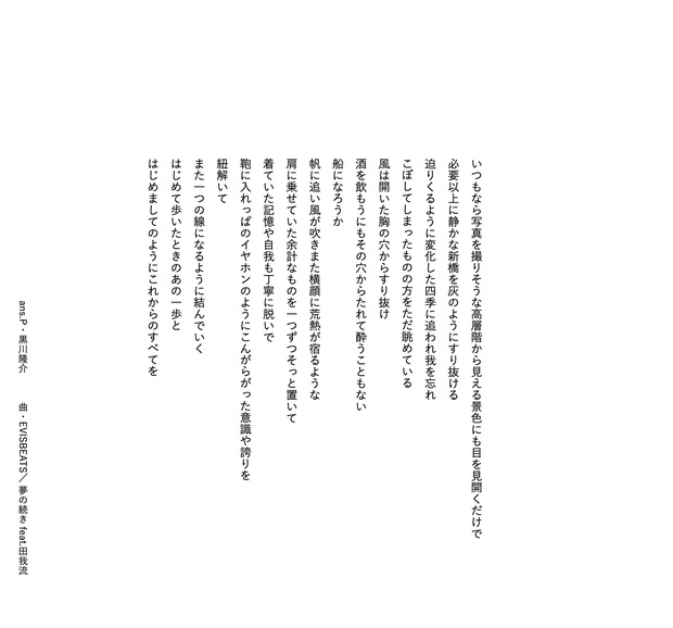 気鋭の若手詩人・黒川隆介が毎回、洋邦/新旧を問わず、気になるアーティストの楽曲を1曲ピックアップし、その歌詞を咀嚼してアンサーソングならぬ〈アンサーポエム〉を書き下ろすこの連載。今回が最終回となります。最終回の今回取り上げるのは、EVISBEATSの2018年の楽曲“夢の続き feat. 田我流”です。黒川氏が楽曲を浴び続けた結果生まれたアンサーポエム、最後までぜひ楽曲を聴きながらお楽しみください。 *Mikiki編集部