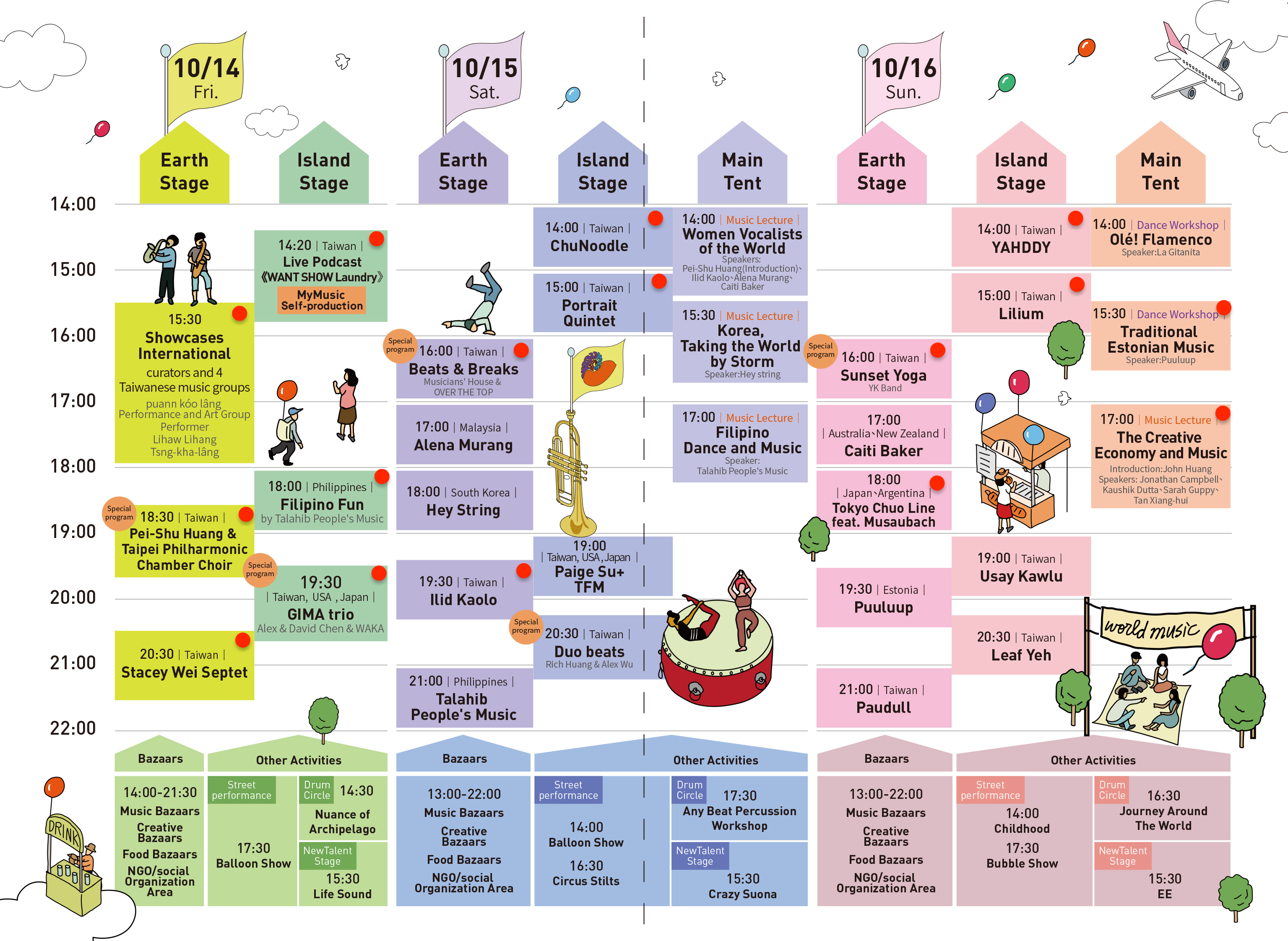 出演:Alena Murang(馬來西亞)/Caiti Baker(澳洲、紐西蘭)/Puuluup(愛沙尼亞)/菲律賓樂舞 by Talahib People’s Music(菲律賓)/Hey String(韓國)/東京中央線 feat. 明馬丁(日本、阿根廷)/黃珮舒 × 台北愛樂室內合唱團 Taipei Philharmonic Chamber Choir/落日瑜珈 × YK band - YK樂團/金音仨- 吳政君 × 陳思銘 × 若池敏弘/傳奇雙擊 - 黃瑞豐 × 吳政君/音舞共生 - 琴人樂坊 Musicians’ House × OVER the TOP/以莉. 高露 Ilid Kaolo/舞思愛 Usay Kawlu/舞思愛/陳建年 Paudull/蘇珮卿 Paige Su + TFM/百合花/魏廣晧 Stacey Wei/葉穎 Leaf Yeh/春麵樂隊 Chu Noodle/畫像五重奏 川樂團/MyMusic Live Podcast《萬秀孫代客洗衣》萬秀洗衣店 Want Show Laundry