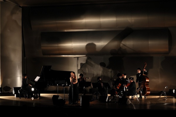 5曲目以降はすべて、八神と宮本(彼女は一部コーラスを取った)の単位にさらにヴァイオリン2、ヴィオラ、チェロ、コントラバス、そしてフルートという編成のTAKETA室内オーケストラ九州の選抜員が加わる。コロナ禍に大分県で鋭意結成されたというTAKETA室内オーケストラ九州の面々は誠心にことにあたりつつ曲によってはやんちゃにストンプ音も加え曲趣を盛り上げ、もう一つの成熟や刺激を無理なく加える。その巧みなアンサンブルのアレンジは宮本貴奈がやっているようだが、八神を中央に置くステージ上の8人はナチュラルに〈ポップ・ミュージック・ビヨンド〉と形容したくなる音楽の像をきっちりと浮かび上がらせていた。