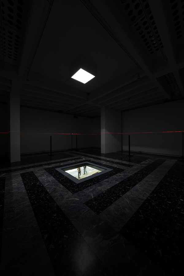おさらいすると、2022年開催の第59回ヴェネチア・ビエンナーレ国際美術展の日本館(主催:国際交流基金)への出品作である《2022》は、フロア一面を使用したインスタレーション作品で、東西南北それぞれの角に設置したレーザー装置と並行光LEDが発する光を高速で回転する鏡に反射させ、四囲の壁面に文字や光の帯として投射するとともに、壁面中央に位置する回転式の超指向性スピーカーから音も聞こえる仕組みになっている。設置作品はその性格から場所柄こそ作品の要諦だが、ジャルディーニ公園の日本館は天井とフロア中央に開口部があるいささか特殊なつくりになっている。ダムタイプは《2022》で、階下のピロティに抜ける正方形の空間をハーフミラーで囲い、空間そのものを心太でも押し出すかのように可視化することで、フロアの開口部をなにものも充填しない空所(Void)にみたてている。