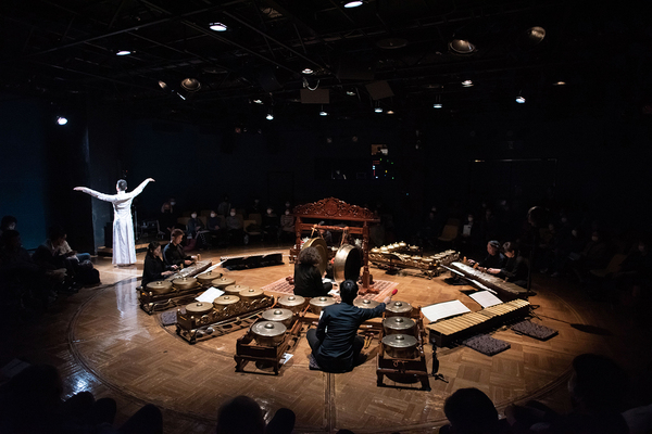 会場となる自由学園明日館はフランク・ロイド・ライトが昭和初期に手掛けた、幾何学を感じさせる清楚な佇まいが実に心地よい空間だ。『ガムラン曼荼羅』の意外なほどに優しくゆるやかな金属のトーンは、雨だれや木漏れ日のきらめきや鳥のさえずりや様々な熱帯の自然の姿を彷彿とさせる。ちょうど森のなかから神々が顔を出す熱帯の曼陀羅のようではないか。