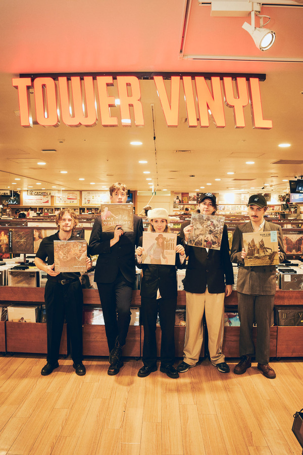 そんなソーリーのメンバーに選盤をお願いしてみたら、いったいどんなレコードを選ぶのか。来日した5人にタワーレコード渋谷店のTOWER VINYL SHIBUYAでそれぞれレコードを一枚ずつ選んでもらい、そのレコードについて語ってもらった。企画の説明を受けた後に5人は思い思いにレコード棚に向かい、顎に手を当てて考え、すれ違い様に会話を交わす。ステージの上とはまた違った魅力のソーリーの姿がそこにあったように思えた。