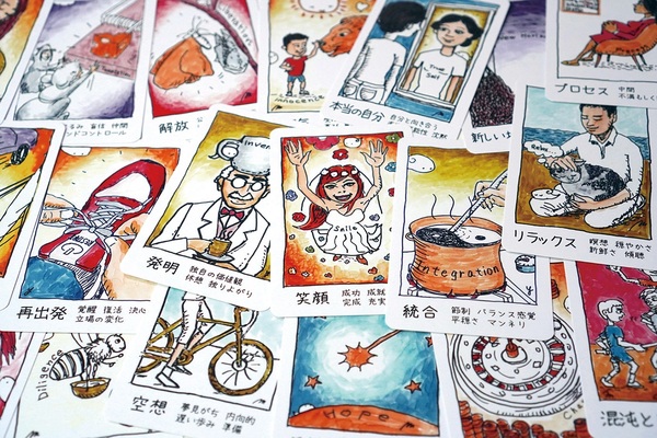「ナラティブ」は〈ひらめき〉を得るためのクリエイティブカードです。カード版とアプリ版があります。B・イーノのカード作品「オブリーク・ストラテジーズ」に影響を受けました。タロットを再検証、認知行動療法、ナラティブ・セラピー、量子力学の考えを取り入れました。様々な方に試させて頂きながら、試行錯誤して作りました。調和、悲しみ、プロセス……などヒントが描かれた裏返した40のカードから、これだと思うものを選びます。出たカードの意味を考察し、直感的な気付きを得るのが目的です。偶然出たカードの意味を自分の経験と即興的に結びつけ考察する、という感覚は、まさに私がやっている即興の音楽演奏の感覚と同じです。