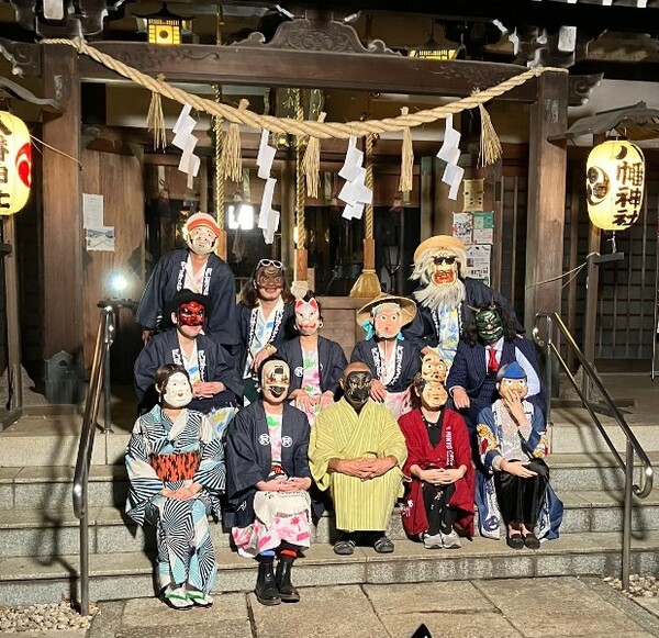 住宅地の中の普段静かな神社にお面をつけた集団と、骸骨のバックプリントのシャツを着た背の大きな男…という非日常的な光景に、たまたま通りかかった人も、昔話の「こぶとり爺さん」の鬼の宴会を見てしまったかのような顔をして立ち去るのでした(笑)。